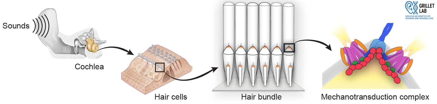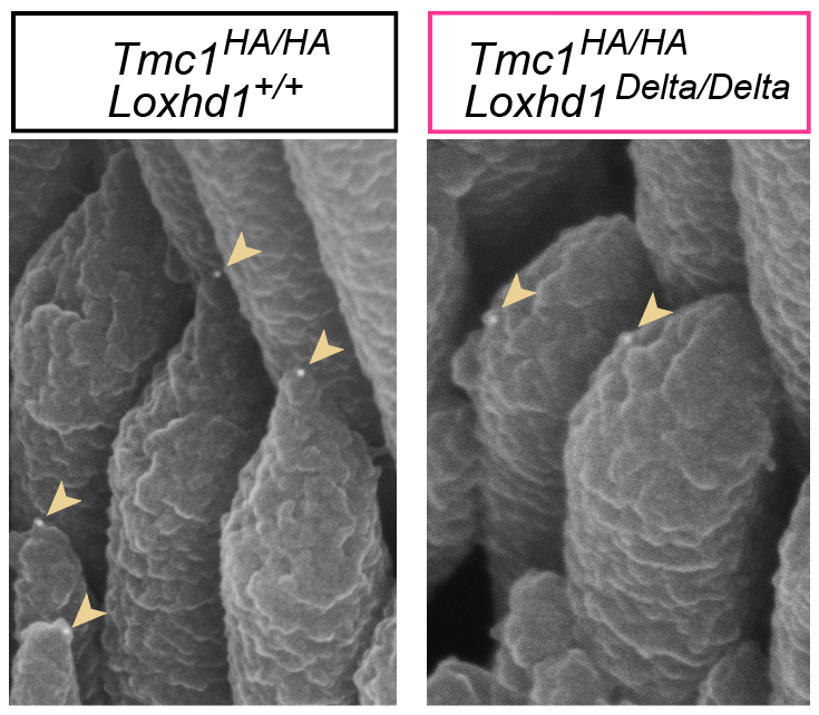 We identified LOXHD1 as the gene responsible for the recessive form of hearing loss DFNB77 (Grillet et al., AJHG, 2009). In mouse models, we showed that Loxhd1 mutations impair auditory mechanotransduction without disrupting tip links or hair bundle morphology (Trouillet et al., J. Neurosci., 2021). More recently, we demonstrated that loss of LOXHD1 leads to the progressive mislocalization of TMC1 channels from their normal position at the stereocilia tips, preventing their mechanical activation by sound (Wang et al., Nat. Commun., 2024). In the same study, we also showed that LOXHD1 can bind, in vitro, to several other components of the mechanotransduction complex. Our current goal is to map these protein interactions in detail and determine whether LOXHD1 influences the biophysical properties of the auditory transduction channels.