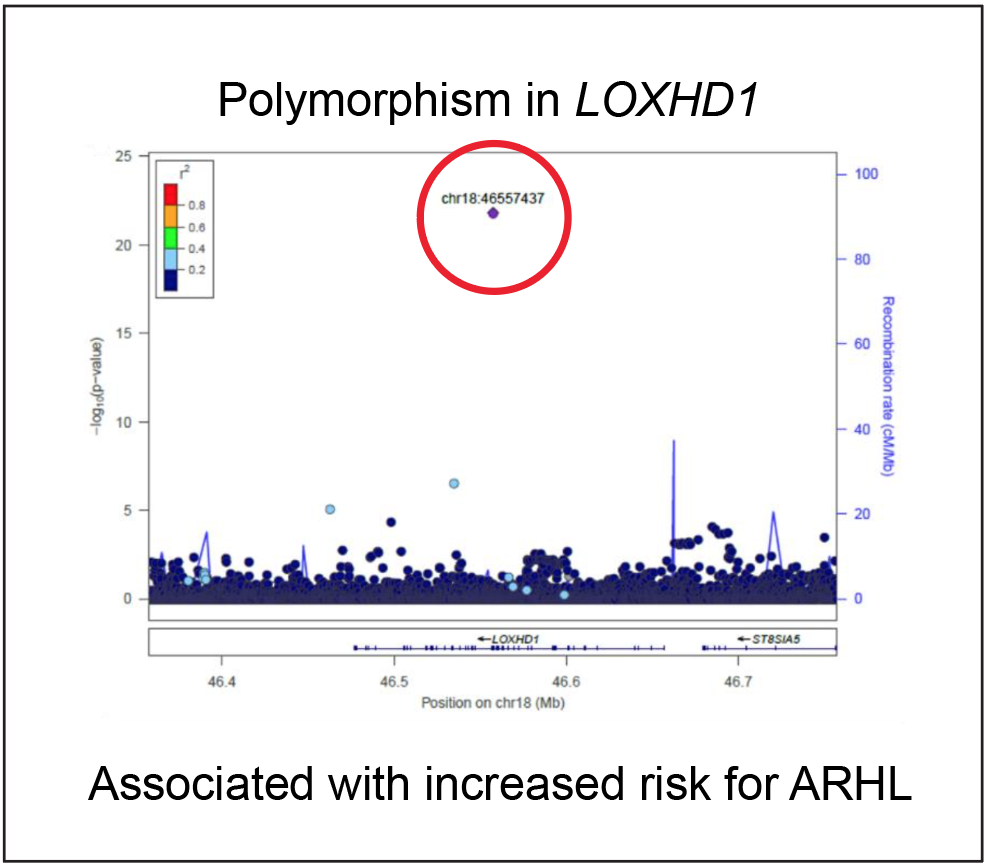 Given the high evolutionary conservation of hearing-related genes and mechanisms across mammals, we propose that the ARHL-associated missense variant in LOXHD1 can be functionally modeled in mice to evaluate its pathogenicity. We have generated this mouse model and will determine whether the variant is indeed causal. In addition to longitudinal hearing assessments, we will investigate whether the polymorphism affects susceptibility to noise-induced hearing loss.